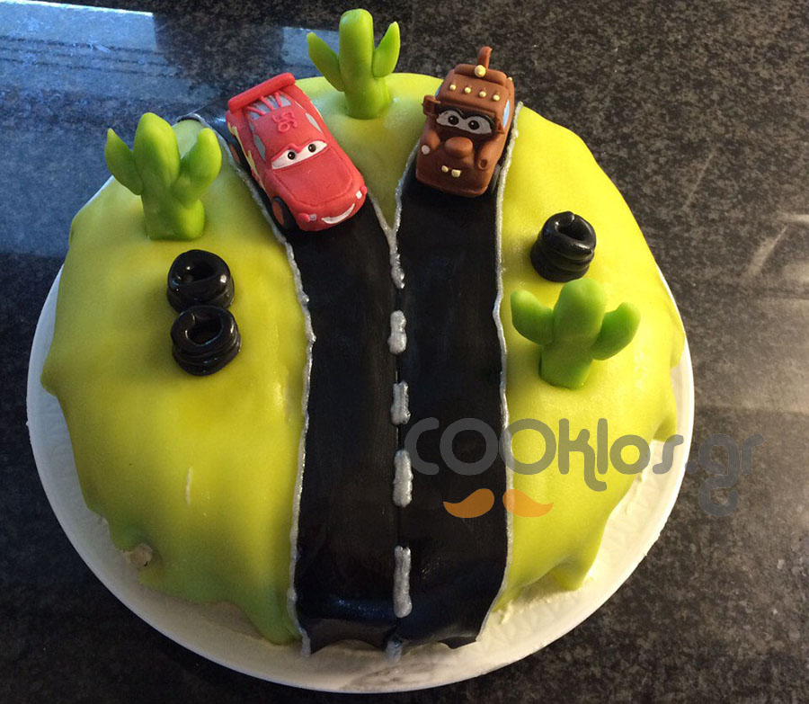 - Ανοίγουμε ένα μέρος της μαύρης ζαχαρόπαστας και φτιάχνουμε το δρόμο. Τον στρώνουμε στο κέντρο. Κάνουμε τη διαγράμμιση με το γκλίτερ. Φτιάχνουμε ρόδες με μαύρη ζαχαρόπαστα και με λαχανί τους κάκτους. Στολίζουμε με τα αυτοκινητάκια και βάζουμε στο ψυγείο. Τη βγάζουμε από το ψυγείο 15 λεπτά πριν την κόψουμε.
